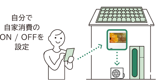 お客さまご自身で、リモコンや「わかすアプリ」から、太陽光発電の自家消費のON/OFFを設定いただけます。