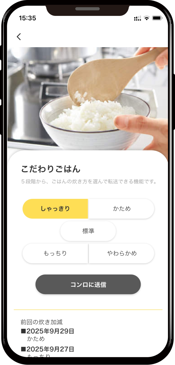 食べた感想をアプリのアンケートに回答するだけで、9種の炊き加減をコンロが自動で炊き上げ。繰り返すことで好みのごはんを見つけます。