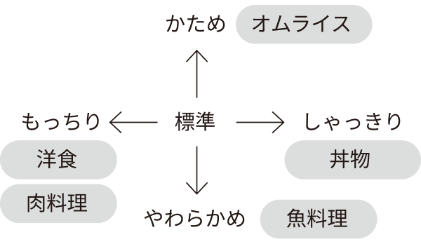 普段は家族の好みの「もっちり」に。オムライスの日は「かため」に。献立やお好み、体調に合わせて5種の炊き分けができます。