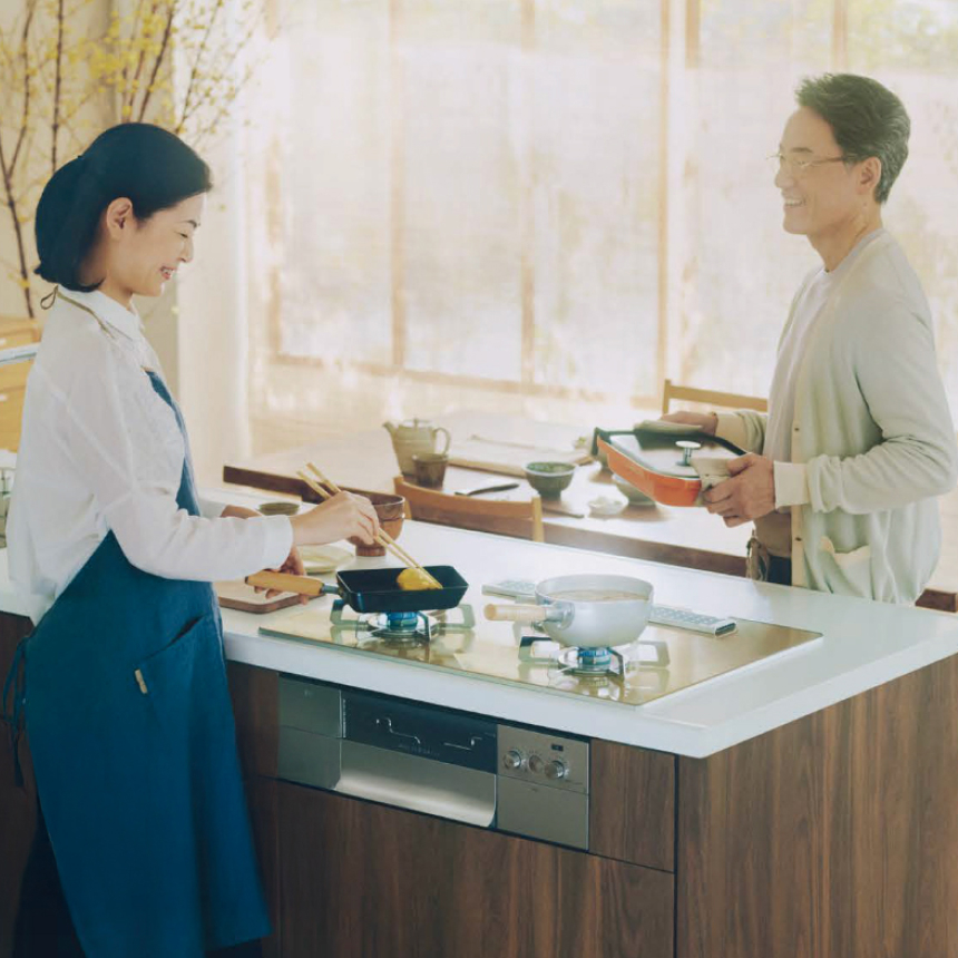 ガス炊飯がワンタッチでできるので炊飯ジャーも要らず、炊飯を押してから、ゆったり味噌汁やおかずを作ります。