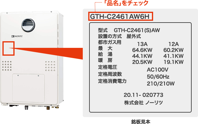 ①「給湯器本体の正面」または「取扱い説明書」をご確認ください
