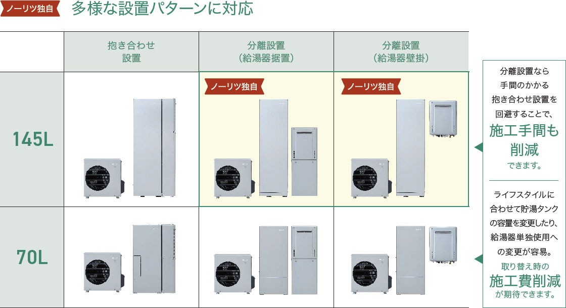 新築/既築、145L MODEL、70L MODEL問わず多様な設置パターンや京商住宅(D500)設置にも対応します。