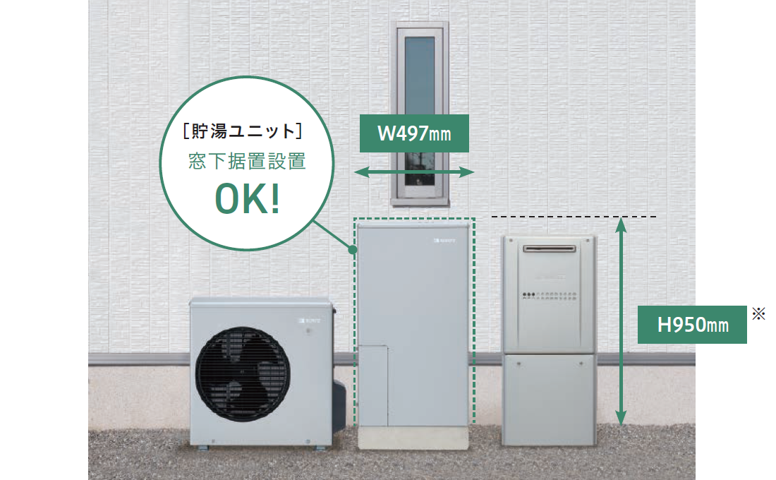 基礎工事が不要となるだけではなく、貯湯ユニットの高さが低いため、窓下設置も可能となります。