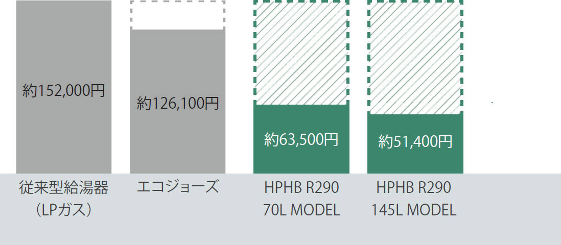 - ※1【試算条件】●平成28年省エネルギー基準に準拠した「エネルギー消費性能計算プログラム(住宅版)Ver3.8.0」(6地域)により算出。●年間給湯・保温負荷18.3GJ ●従来型給湯器:2006年度基準エネルギー消費効率81.7%、エコジョーズ:モード熱効率92.5% ●LPG料金5.9円/MJ ※出典元:石油情報センター(令和4年度月次平均価格(50m3)データの単純平均より) ●電気料金31円/kWh(全国家庭電気製品公正取引協議会『電力料金の目安単価』より) ●水道料金265円/m3(一社)日本パルプ工業会 ●新商品は、現段階の開発測定値(25年4月時点)(株)ノーリツ調べ